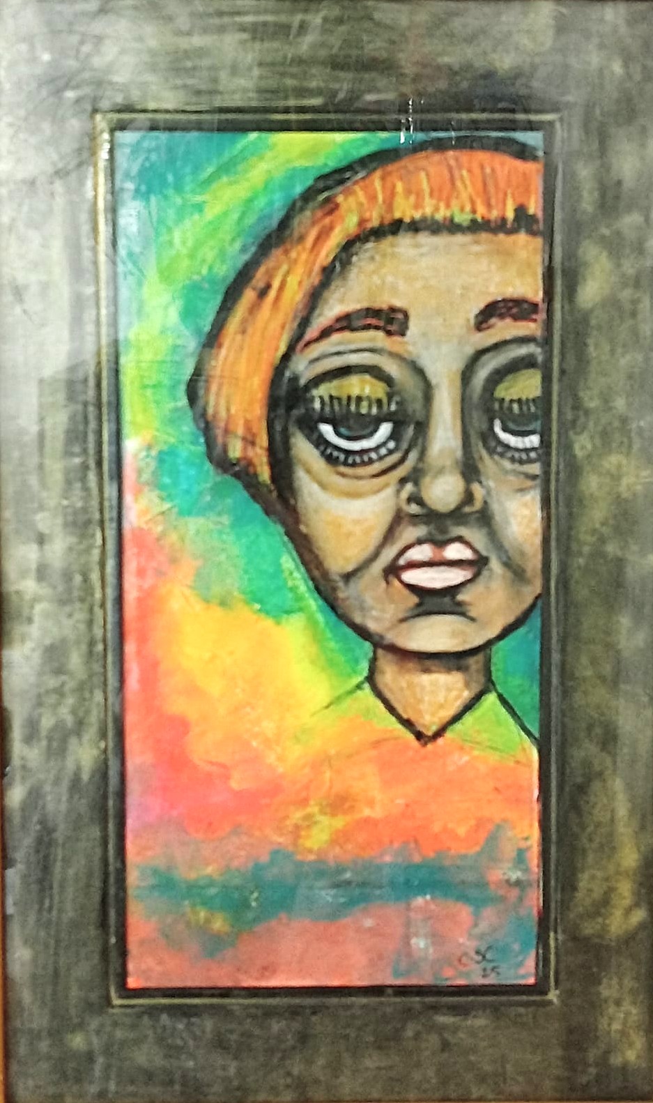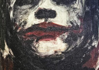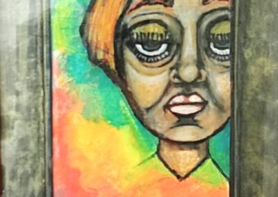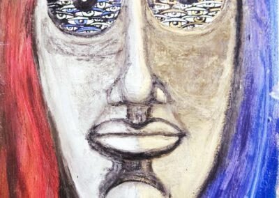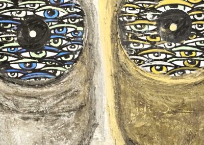When you see her work, you can’t help but be mesmerised by the eyes she paints, drawing your focus to sometimes an uneasy feeling.  Artists throughout history have used the eyes to command attention and tell a story, emphasising powerful emotions, carrying symbolic weight, and reflecting their inner journeys through their gaze. Caroline’s work feels vulnerable in a particular way, and I am left with a searching feeling, a yearning for a truth, but what truth?